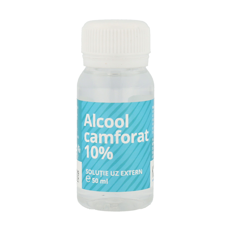 Alcool Camforat 10%: dezinfectant, revulsiv, calmant al pruritului, antiseptic cu aciune locala. Compozitie: camfor 10%, alcool etilic 96° -70%, apa purificata q.s.ad. 100% Indicatii: Diverse aciuni dermatologice, urticarie, prurit, degeraturi, cosmetica. Mod de utilizare: Extern: Aplicatii locale si tamponari la nevoie.
