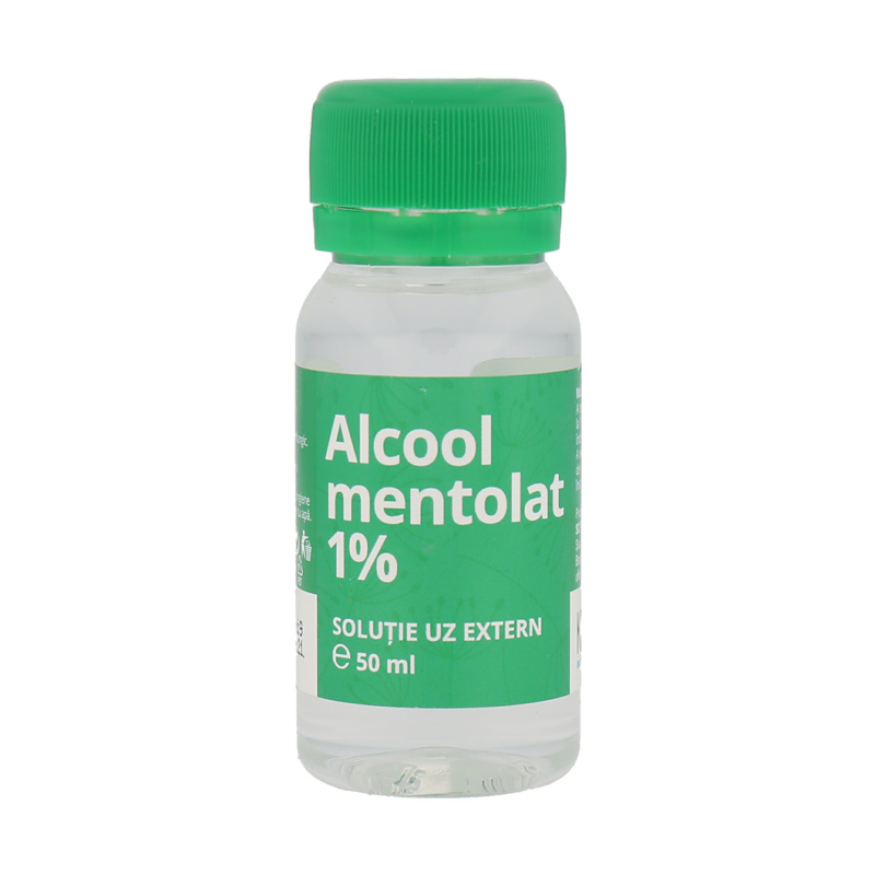 Alcool Mentolat 1%: Dezinfectant local, antiseptic, antimicrobian, antifungic. Compozitie: mentol 1%, alcool etilic 96° q.s.ad.100%. Mod de utilizare: extern- badijonari si tamponari locale; inhalatii si gargarisme pentru dezinfectarea mucoasei bucofaringiene – cateva picaturi intr-un pahar cu apa.