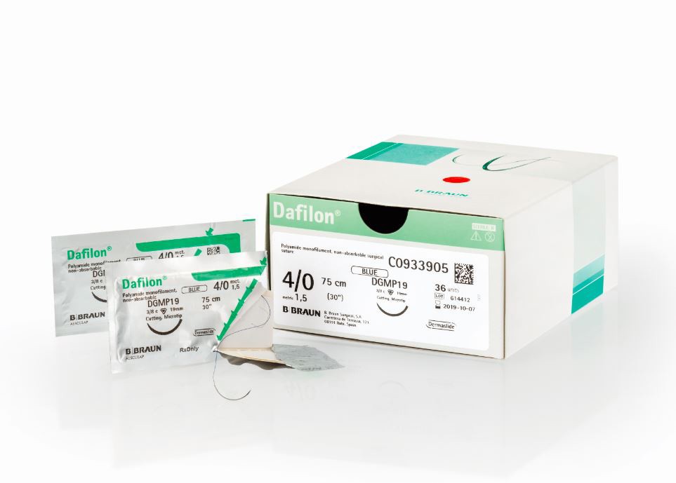 Dafilon Blue fir de sutura neresorbabil,albastru, monofilament, poliamida, 6/0 USP (0,7 EP), L=60 cm, ac triunghiular standard, curbura 3/8, 12 mm. Cutie cu 36 fire *Imagine generala cu titlu de prezentare