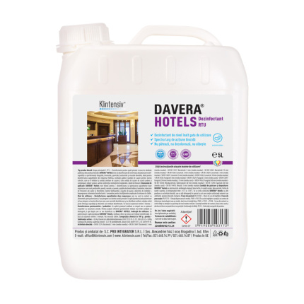 DAVERA® HOTELS – solutie gata de utilizare – este un dezinfectant dezodorizant multi-suprafete, de nivel inalt, cu performante fungicide, bactericide si virucide dovedite. Produsul are AVIZ BIOCID Nr. 2267BIO/02/12.24 eliberat de Ministerul Sanatatii – Comisia Nationala pentru Produse Biocide. Substante active: clorura de didecildimetilamoniu, concentratie in unitati metrice 18 g%; compusi cuaternari de amoniu, benzil-C12-C18-alchildimetil, cloruri, concentratie in unitati metrice 2,8 g%; poli (hexametilenebiguanida), polimer, concentratie in unitati metrice 1,3 g%. Avantajele produsului: curata si dezinfecteaza intr-o singura procedura elimina germenii intr-un timp scurt compatibil cu diverse suprafete actiune virucida, fungicida si bactericida certificata testat conform reglementărilor UE in vigoare DAVERA® HOTELS este folosita pentru dezinfectarea suprafetelor din industria HoReCa, institutii publice (unitati de cazare pentru turism colectiv, cum ar fi hoteluri si unitati similare de cazare si alte unitati de cazare de scurta sedere si de tip camping, tabere scolare, sali de conferinta, institutii de invatamant, cladiri de birouri).