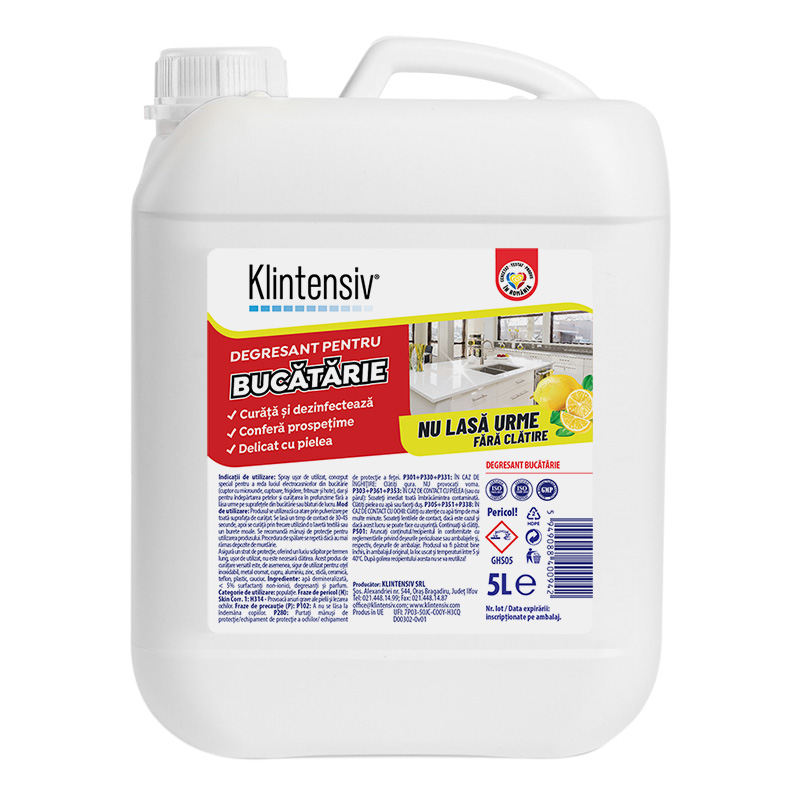 DEGRESANT BUCĂTĂRIE Indicații de utilizare: Degresant bucatarie, conceput special pentru a reda luciul electrocasnicelor din bucătărie (cuptor cu microunde, cuptoare, frigidere, friteuze și hote), dar și pentru îndepărtarea petelor și curățarea în profunzime fără a lăsa urme pe suprafețele din bucătărie sau blaturi de lucru. Mod de utilizare: Produsul se utilizează ca atare prin pulverizare pe toată suprafața de curățat. Se lasă un timp de contact de 30-45 secunde, apoi se curăță prin frecare utilizând o lavetă textilă sau un burete moale. Se recomandă mănuși de protecție pentru utilizarea produsului. Procedura de spălare se repetă dacă au mai rămas depozite de murdărie. Asigură un strat de protecție, oferind un luciu sclipitor pe termen lung, ușor de utilizat, nu este necesară clătirea. Acest produs de curățare versatil este, de asemenea, sigur de utilizat pentru: oțel inoxidabil, metal cromat, cupru, aluminiu, zinc, sticlă, ceramică, teflon, plastic, cauciuc.