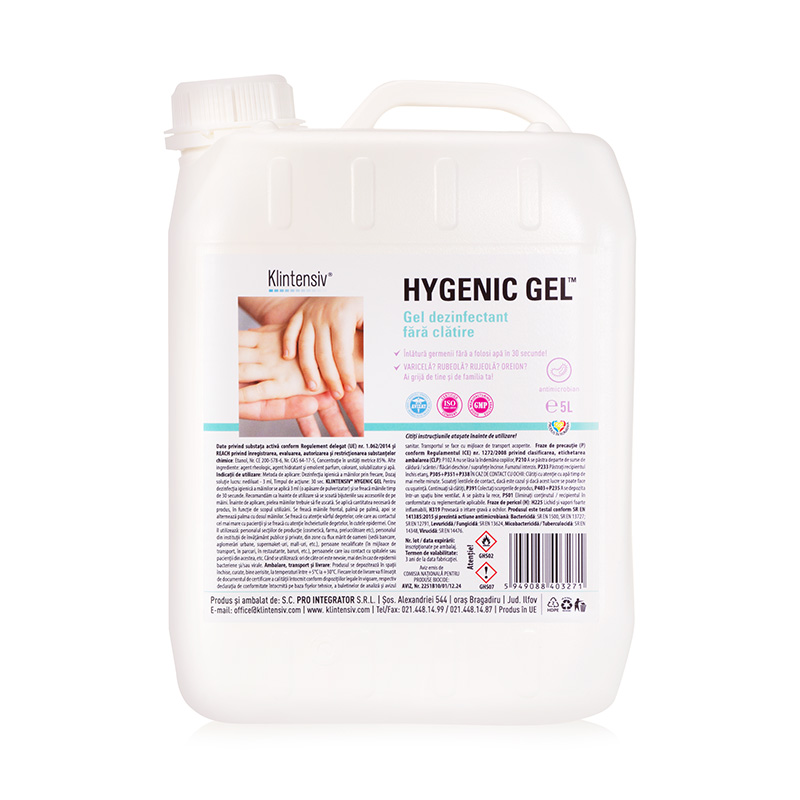 Pentru situatii in care nu aveti apa si sapun la indemana, HYGENIC GEL® este un dezinfectant gel potrivit pentru maini. Inlatura germenii in doar 30 de secunde. Se poate utiliza in orice moment al zilei, ori de cate ori este nevoie, in special in caz de epidemii bacteriene si/ sau virale, avand capacitatea de protectie a unui dezinfectant medical. Produs biocid- Aviz Nr. Nr. 2251BIO/01/12.24 emis de Comisia Nationala pentru produse biocide. Avantajele produsului: reduce eficient germenii dezinfecteaza rapid (30 de secunde) ofera protectie impotriva varicelei, rujeolei, rubeolei si oreionului este eficace inclusiv in timpul unei epidemii virale are actiune virucida, fungicida si bactericida certificata testat conform normelor UE in vigoare Grupa principala 1: Dezinfectante si produse biocide Tip de produs 1: – Este un produs biocid destinat igienei umane. Antispetic hidroalcoolic pentru dezinfectarea igienica a mainilor. Substanta activa: Etanol, Concentratie in unitati metrice 85% Categoria de utilizatori: profesionali, populatie Produsul dezinfectant gel poate fi utilizat in scop medical, in cabinete si spitale, dar si in saloane cosmetice si centre SPA, farmacii si producatori de medicamente, institutii publice, operatori din Industria HoReCa, retaileri de orice dimensiune, banci si ale institutii cu trafic intens, parcuri si zone de agrement, taxi si mijloace de transport in comun, utilizatori casnici. Substanta activa: Etanol, concentratie in unitati metrice 85% Indicatii de utilizare: Scop: Dezinfectarea igienica a mainilor prin frecare Mod folosire: Pentru dezinfectarea igienica a mainilor: se aplica 3 ml (o apasare de pulverizator) si se freaca mainile timp de 30 secunde. In scop medical: se aplica 6 ml (doua apasari de pulverizator), se freaca mainile timp de 120 secunde, apoi se mai adauga 3 ml (inca o apasare de pulverizator) si se freaca din nou mainile timp de 60 secunde.Recomandam ca inainte de utilizarea produsului dezinfectant gel sa se scoata bijuteriile sau accesoriile de pe maini. Inainte de aplicare, pielea mainilor trebuie sa fie uscata. A se folosi numai dupa ce au fost citite si intelese instructiunile de utilizare. Este recomandata depozitarea in spatii inchise, curate, bine aerisite, cu temperaturi cuprinse intre + 5 °C si + 30°C. Fiecare lot de livrare va fi insotit de documentul de certificare a calitatii, intocmit conform dispozitiilor legale in vigoare, respectiv declaratia de conformitate intocmita pe baza fiselor tehnice, a buletinelor de analiza si a avizului sanitar.