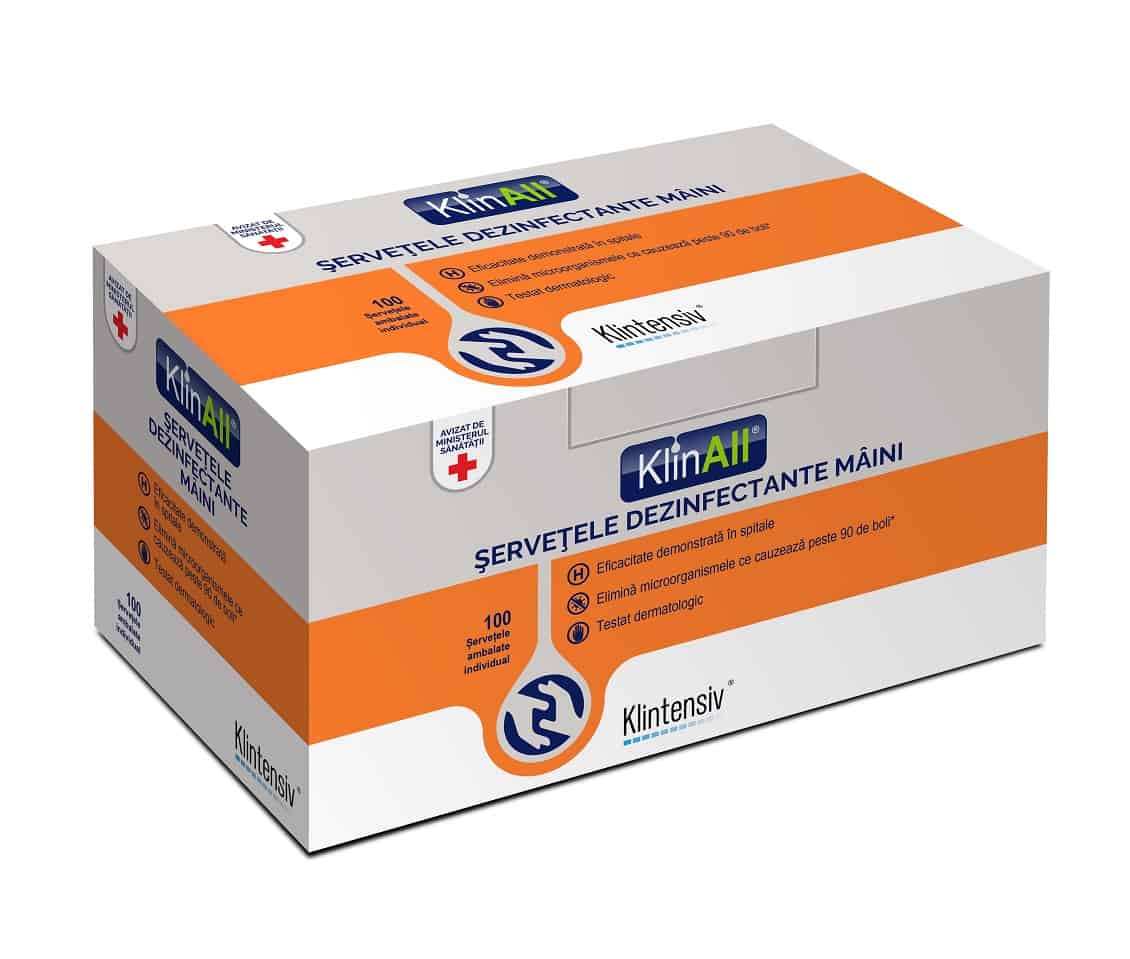 Servețelul dezinfectant mâini KlinAll® este îmbibat cu soluție de etanol cu concentrație de 85%. Are acțiune virucidă, bactericidă, levuricidă și fungicidă certificată.