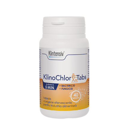Klintensiv® KlinoChlor Tabs, tablete efervescente clorigene, sunt destinate dezinfectării suprafețelor din zone specifice industriei alimentare, farmaceutice, cosmetice, hotelieră și de creștere a animalelor (zonele de pregătire a hranei, fără a fi în co
