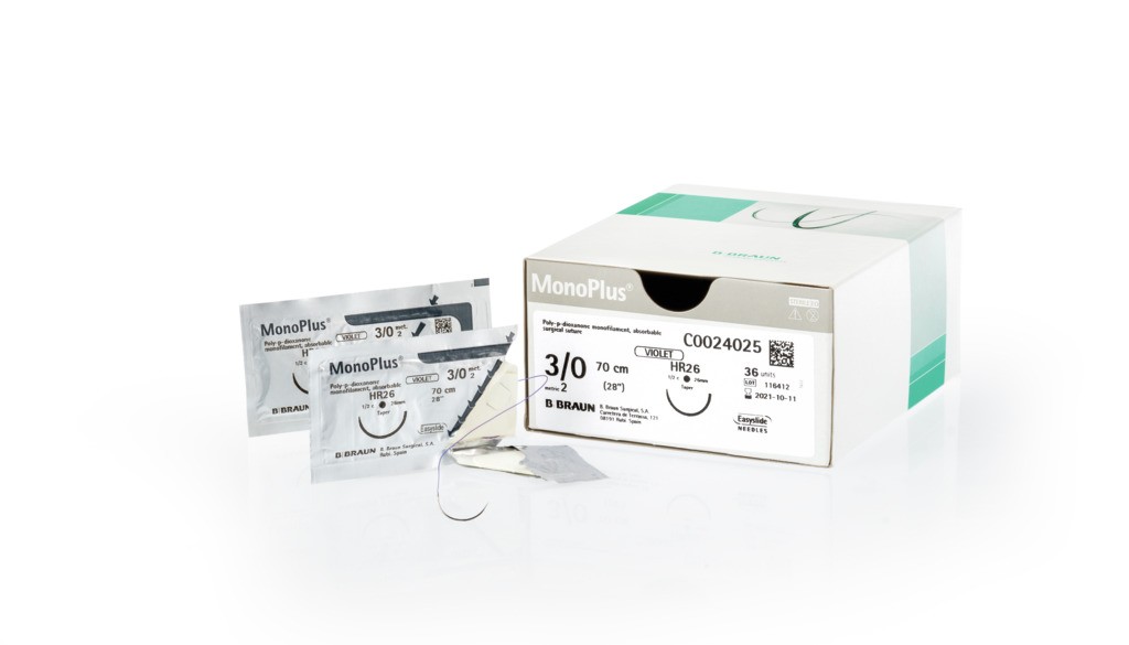 Monoplus fir de sutura resorbabil,violet, absorbtie termen lung, monofilament, polidioxanona, 1 USP (4 EP), L=70 cm, ac rotund, ranforsat, curbura 1/2, 37 mm. Cutie cu 36 fire *Imagine generala cu titlu de prezentare
