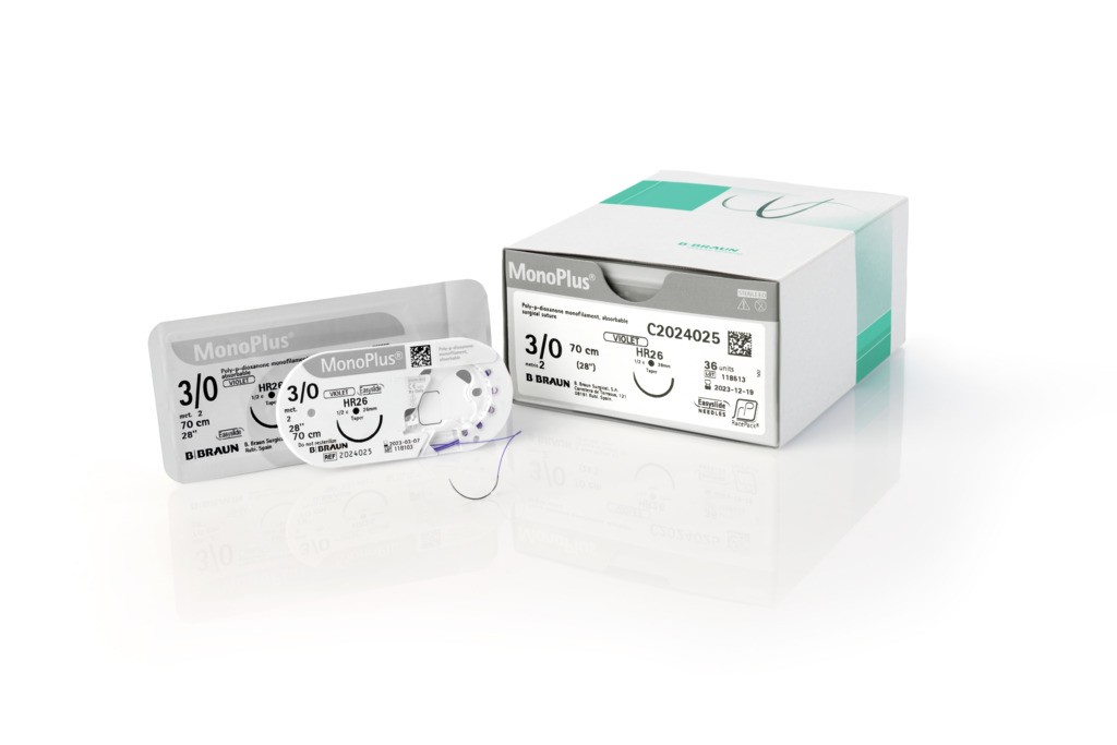 Monoplus fir de sutura resorbabil,violet, absorbtie termen lung, monofilament, polidioxanona, 3/0 USP (2 EP), L=70 cm, ac triunghiular, standard, curbura 3/8, 24 mm. Cutie cu 36 fire *Imagine generala cu titlu de prezentare