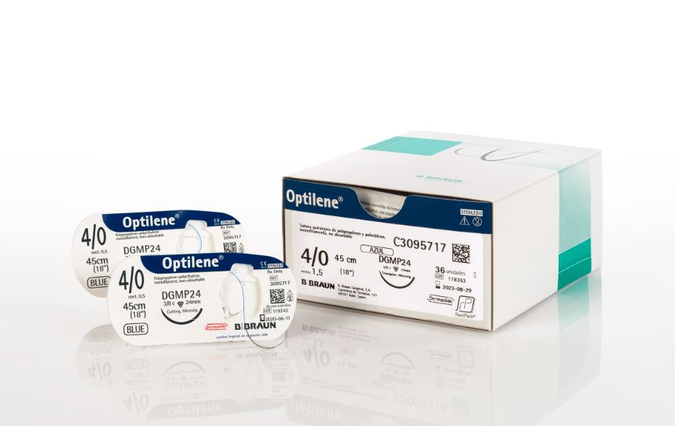 Optilene fir de sutura neresorbabil,albastru, monofilament, polipropilena cu polietilena, 5/0 USP (1 EP), L=90 cm, dublu armat, ace rotunde standard, curbura 3/8, 13 mm. Cutie cu 36 fire *Imagine generala cu titlu de prezentare