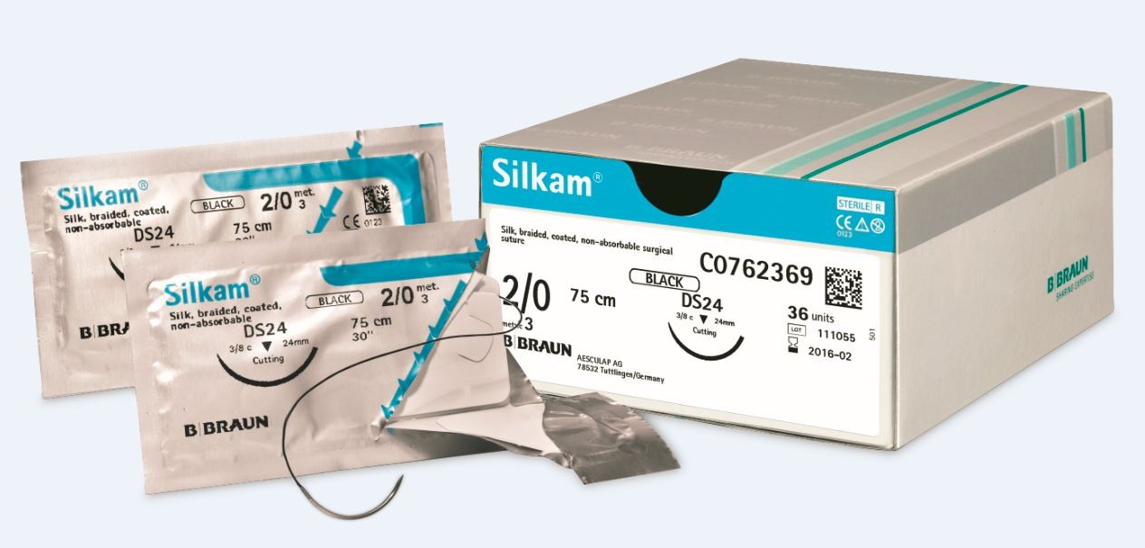 Silkam Black – fir de sutura neresorbabil, negru, multifilament acoperit, matase, 0 USP (3,5 EP), L=75 cm, ac rotund, standard, curbura 1/2, 30 mm Cutie cu 36 fire * Imagine generala cu titlu de prezentare