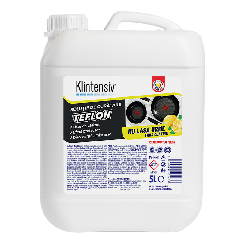 SOLUȚIE CURĂȚARE TEFLON Indicații de utilizare: curățarea manuală a vaselor de gătit acoperite cu teflon. Mod de utilizare: Produsul se utilizează ca atare prin pulverizare abundentă pe toată suprafața de curățat. Se lasă un timp de contact de 30-45 secunde, apoi se curăță prin frecare utilizând o lavetă, un prosop de bucătărie sau un burete moale. Se recomandă mănuși de protecție pentru utilizarea produsului. Asigurați-vă că ștergeți toate zonele din interiorul și exteriorul tăvii, inclusiv mânerul acesteia. Clătiți cu apă caldă sub jet moderat toate reziduurile din recipientul curățat cu soluție. Procedura de spălare se repetă dacă au mai rămas depozite de murdărie. NU utilizați materiale de curățare abrazive pe tigăi de teflon. Materialul abraziv poate deteriora și îndepărta acoperirea neaderentă a tăvii. Acest produs de curățare versatil este, de asemenea, sigur de utilizat pentru: oțel inoxidabil, cupru, aluminiu, zinc, sticlă, ceramică, teflon, plastic.