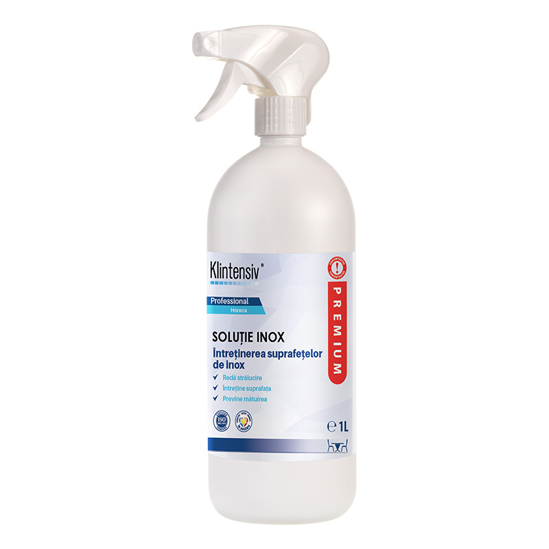 Acest produs asigură un luciu de excepție suprafețelor de inox. Produs recomandat pentru îndepărtarea depunerilor de calcar, rugina, cruste de pe utilajele metalice și suprafețe de inox, aluminiu, crom, nichel, sticlă, celule de fierbere, utilaje din metal, oale, pahare, cafetiere. Redă strălucirea, previne mătuirea si întreține suprafața fără a o zgâria. Are proprietați antistatice, drept urmare, grăsimea și murdăria se depun cu dificultate. Compoziție: În acord cu recomandările 648/2004 EEC: apă, solvenți