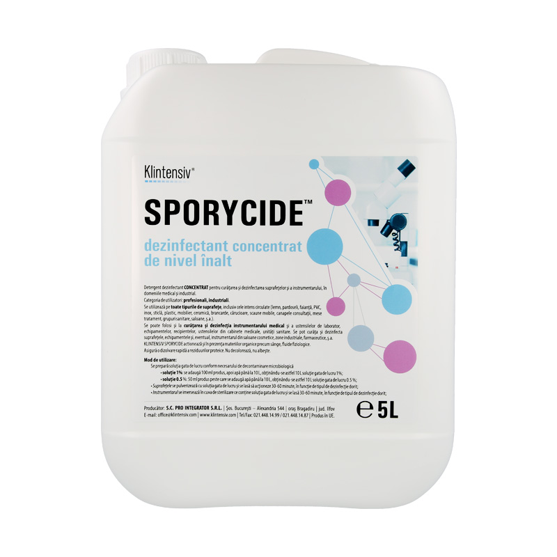 SPORYCIDE® – Dezinfectant concentrat de nivel inalt are un efect optim asupra suprafetelor de lucru si a obiectelor de inventar. Curata si dezinfecteaza cu succes suprafetele si microaeroflora din spatii private si zone de sanatate publica.