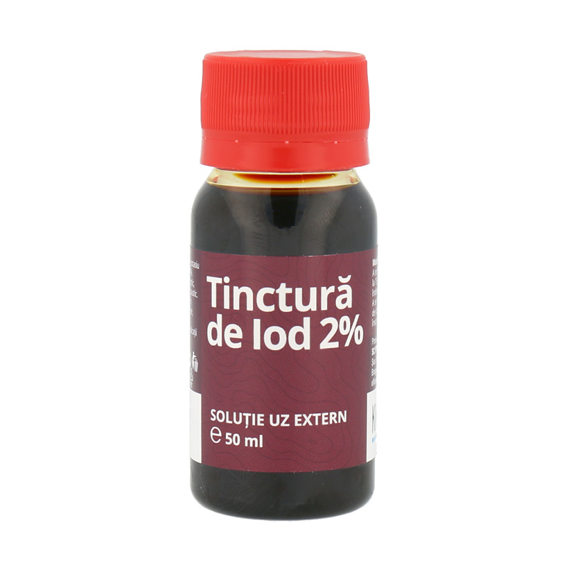 Tinctura de Iod: dezinfectant, antiseptic, micostatic cu actiune locala, caustic. Indicatii: Unele piodermite, in diverse afectiuni dermatologice, dermatomicoze, ca revulsiv. Compozitie: iod 2%, iodura de potasiu 3%, alcool etilic 50° q.s.ad. 100%. Mod de utilizare: extern- aplicatii locale, badijonari la nevoie.